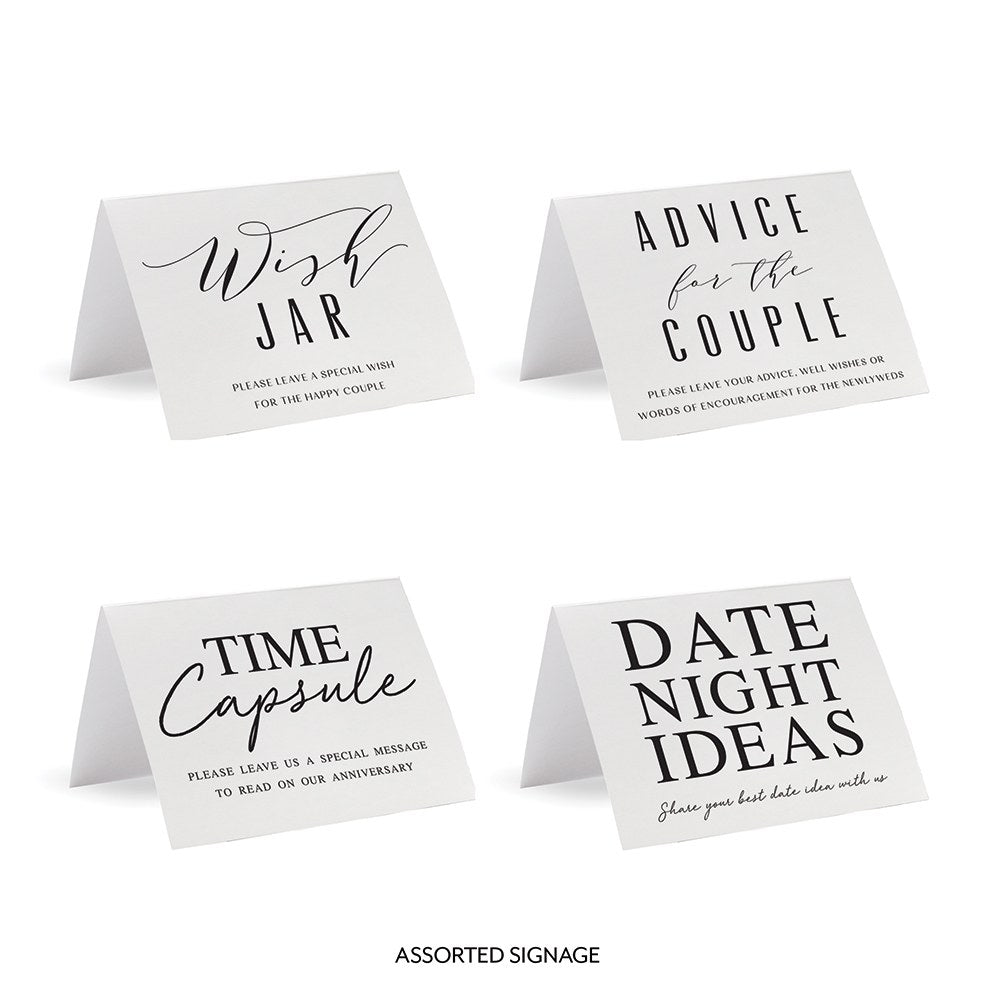 - Includes 4 assorted signage pieces to choose from: Wish Jar, Advice for the Couple, Time Capsule, and Date Night Ideas