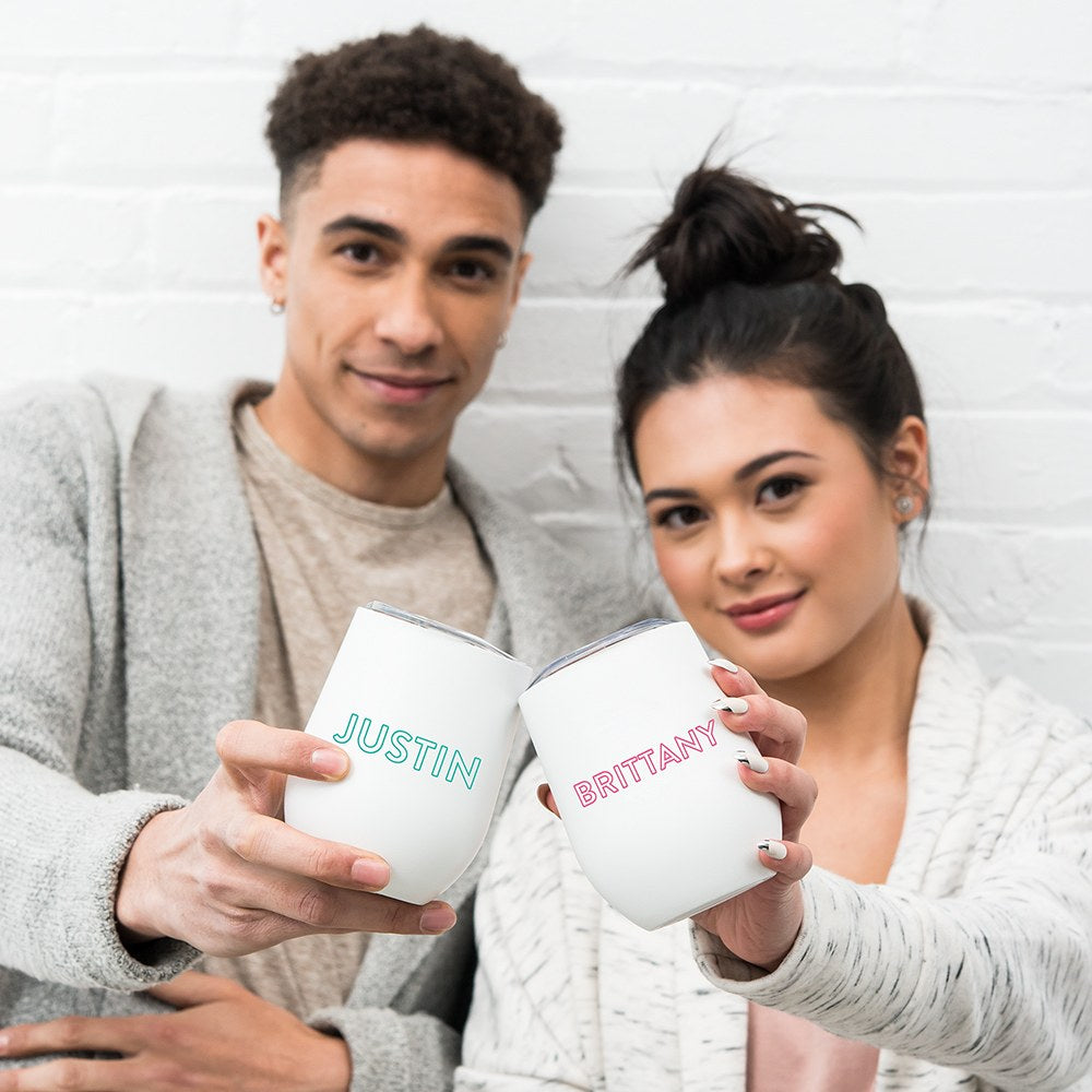 Not just for wine, the personalized stemless wine glass travel tumbler is a drinking glass for all occasions. Portable and stylish, you can fill the insulated travel glass with hot or iced coffee, carbonated beverages, or water! With the spill-preventing plastic lid, you can take any drink with you on the go, and the thermal, insulated stainless-steel tumbler walls keep your beverage at the perfect temperature for longer. Cheap in price, it’s a cute thank you gift, wedding favour for reception guests, or special something to give when you ask your best girlfriends to you your bridesmaids. Outdoor BBQs, social events, or on your way to work, the inexpensive stemless travel tumbler can be your bridal party’s go-to party glass or everyday drinking glass. Available in a range of colours, add a custom printed monogrammed initial and name for a unique personalized accent on each glass.